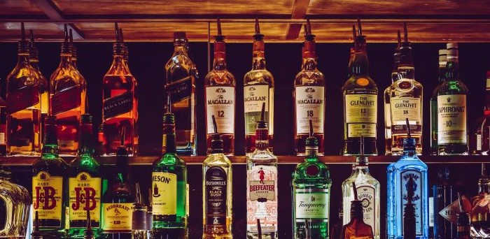 Prestige alcoholic and non-alcoholic drinks: wines, whiskey, cognac, fruit juice.